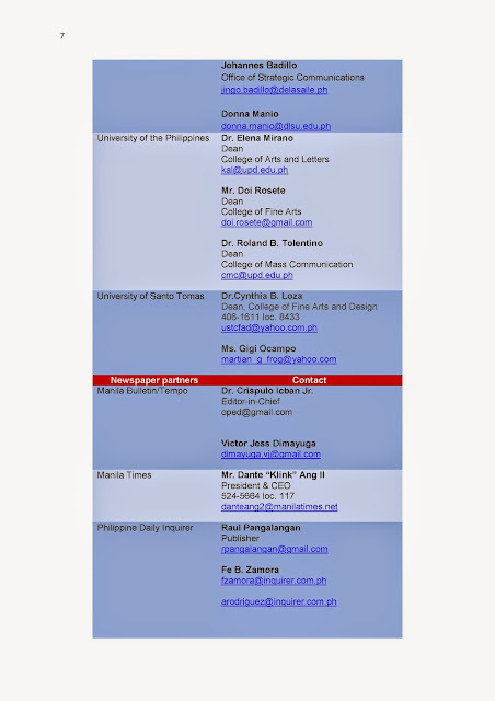 Cartooning for Peace is a network of 130 cartoonists around the world who use the power and language of images to fight for peace and freedom of expression. The network aims to promote a better understanding and mutual respect between people of different cultures and beliefs using cartoons as universal language. The event in the Philippines involves the National Commission for Culture and the Arts ], Center for Media Freedom and Spirituality, UST CFAD, University of the Philippines–Diliman, Dela Salle University (DLSU)-Manila and leading newspaper companies.